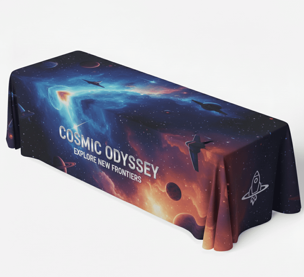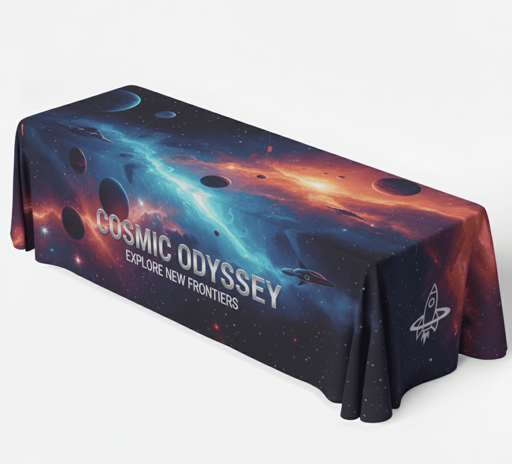 The Print Standard Point 8ft Table Cover is a premium table cloth 8 ft designed to enhance brand visibility at trade shows, exhibitions, corporate events, and professional presentations. Made from durable 8.8 oz tension polyester fabric, this 8 ft table cover features full-color CMYK dye-sublimation printing that produces vibrant, photo-quality graphics that resist fading, cracking, or peeling. Designed to fit standard 8-foot tables (96″ x 30″ x 30″), this 8ft table cover available in both open-back (3-sided) and closed-back (4-sided) styles. The open-back option allows easy access and seating, while the closed-back design offers full 360-degree coverage for a clean, professional appearance. Often used as an 8ft table throw, it creates a polished display that attracts attention and reinforces your brand image.