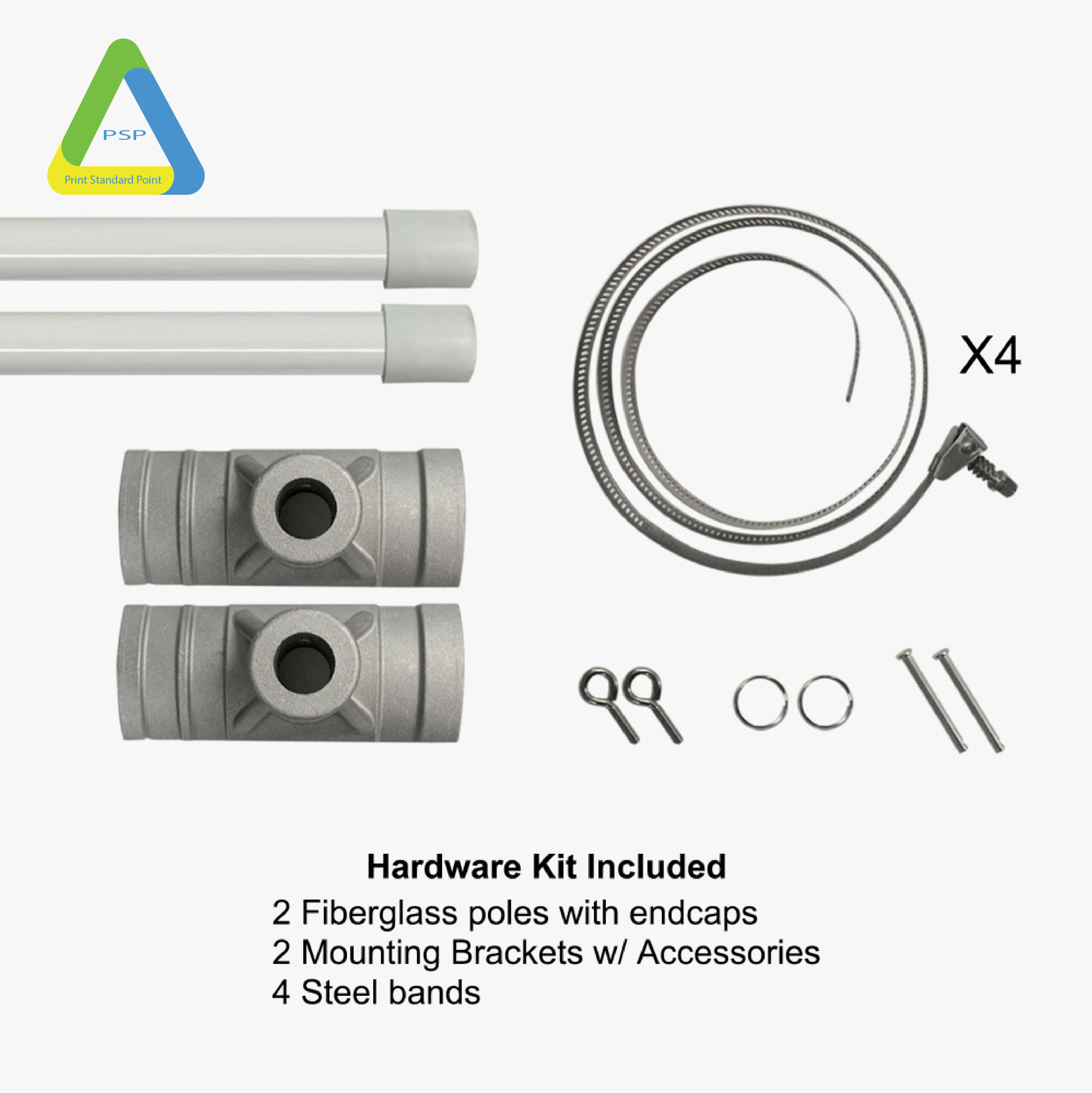 | Hardware Options | Banner + Hardware, Banner Only, Hardware Only. Optional fiberglass pole bracket & hardware kit (2 fiberglass arms, 2 brackets, steel bands). |
