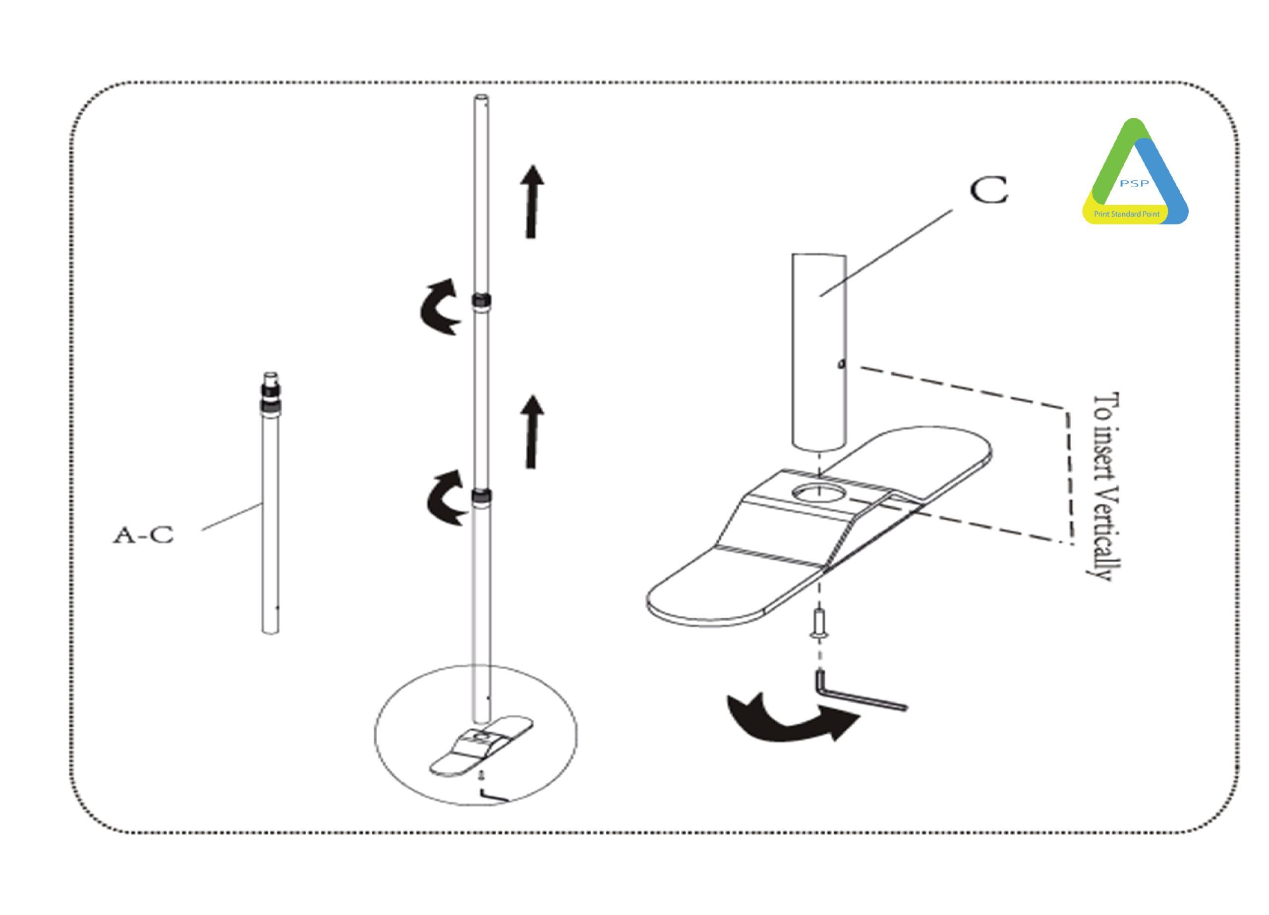 Step 2: Take vertical pole #A-C and insert end C into the pole socket in the base. From the bottom of the base thread hexbolt into end C and tighten.