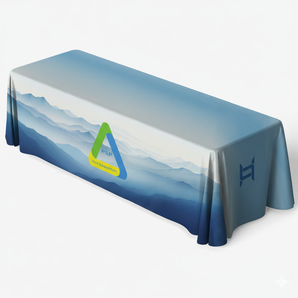 Command attention at large venues and high-traffic events with the impressive scale of the 8′ Table Throw. This expansive size provides maximum visual real estate, making your brand impossible to miss across any ballroom or exhibition floor. Your custom design is flawlessly reproduced using advanced full-color dye-sublimation print, guaranteeing vibrant, permanent colors that will never crack or fade. To suit your operational needs, we offer the functional 3-sided (Open Back) variant, which smartly conceals items while allowing easy entry underneath. If a completely enclosed, premium appearance is your goal, the classic 4-sided (Closed Back) version delivers total, floor-length coverage. Go big and ensure your message is seen clearly with this premium, impactful table cover solution.