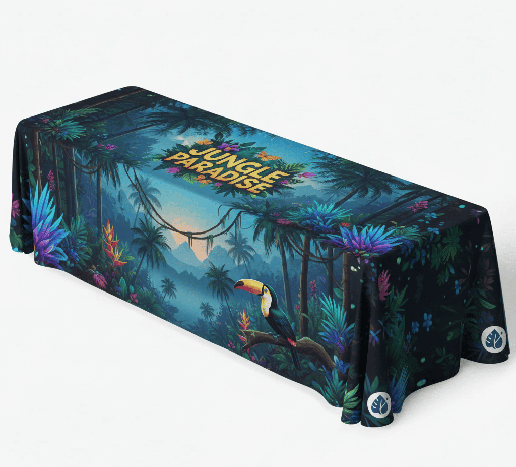 Command attention at large venues and high-traffic events with the impressive scale of the 8′ Table Throw. This expansive size provides maximum visual real estate, making your brand impossible to miss across any ballroom or exhibition floor. Your custom design is flawlessly reproduced using advanced full-color dye-sublimation print, guaranteeing vibrant, permanent colors that will never crack or fade. To suit your operational needs, we offer the functional 3-sided (Open Back) variant, which smartly conceals items while allowing easy entry underneath. If a completely enclosed, premium appearance is your goal, the classic 4-sided (Closed Back) version delivers total, floor-length coverage. Go big and ensure your message is seen clearly with this premium, impactful table cover solution.