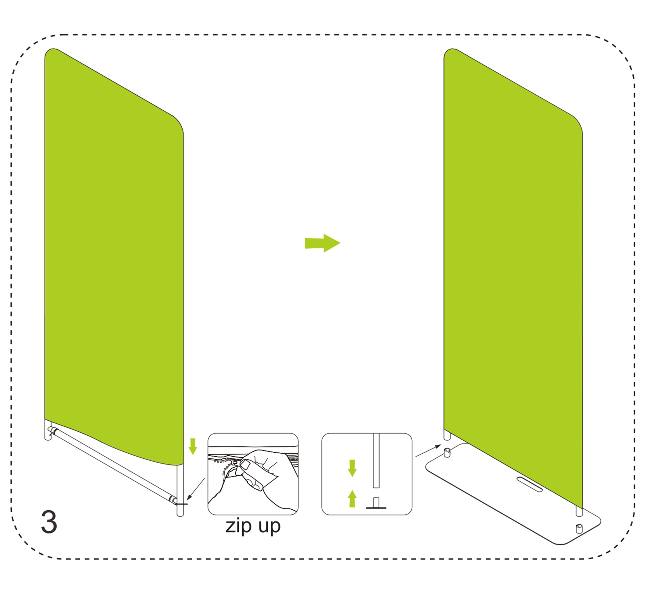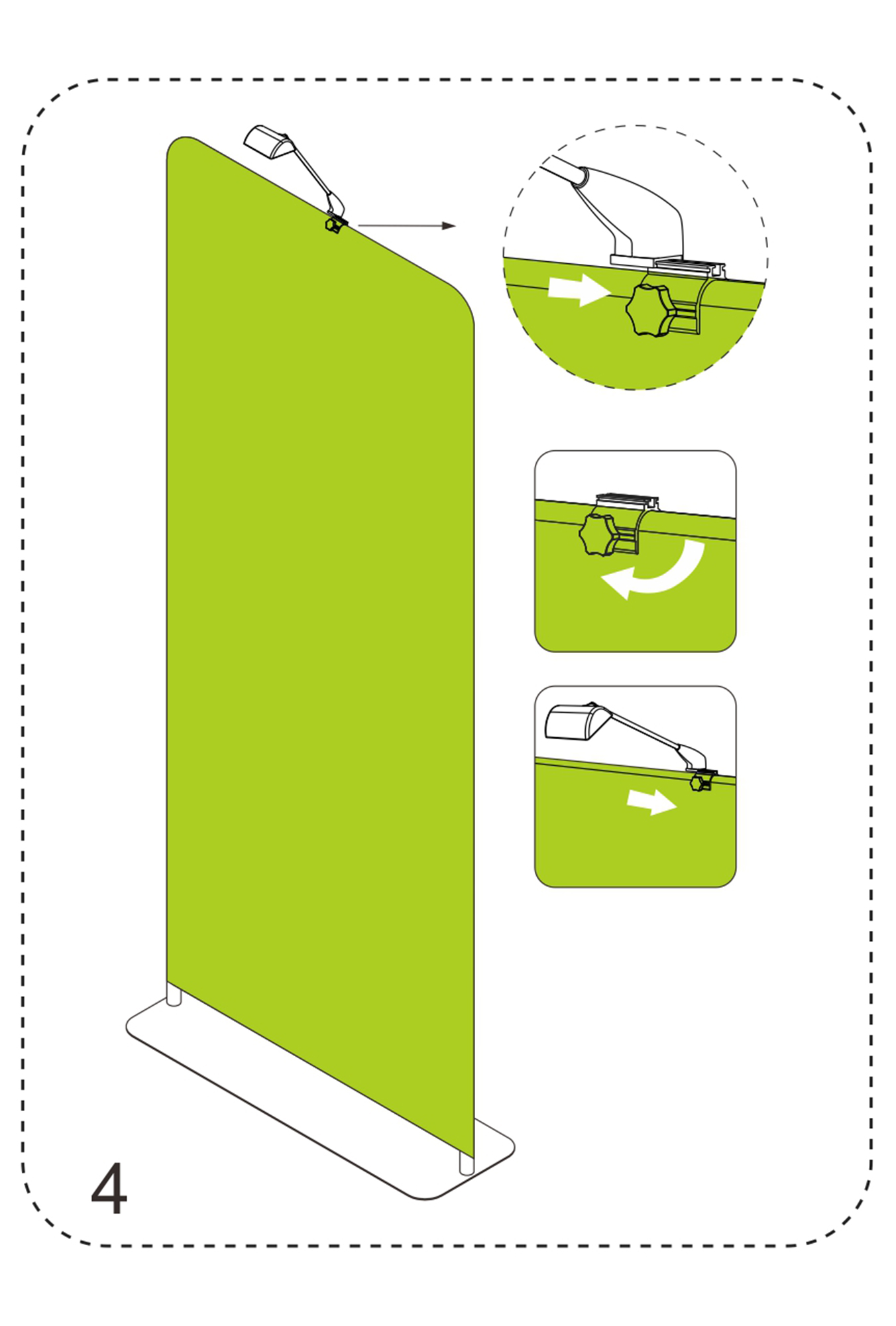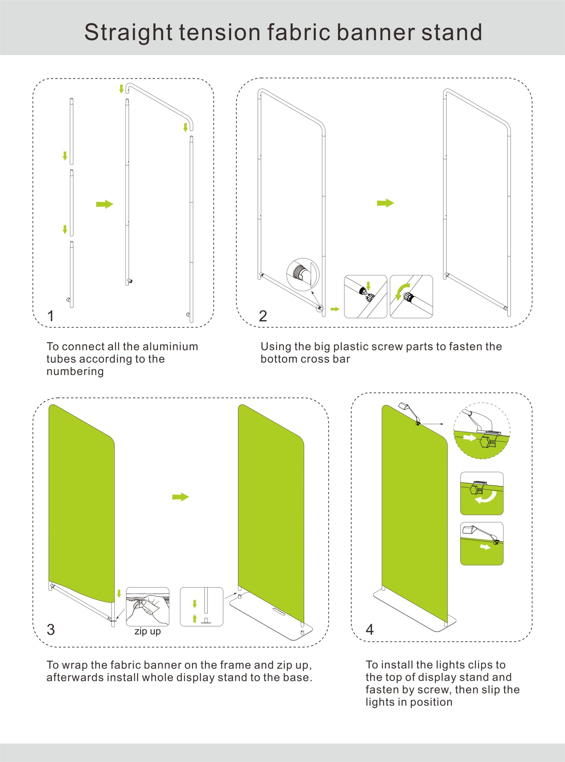 3. To wrap the fabric banner on the frame and zip up, afterwards install whole display stand to the base.